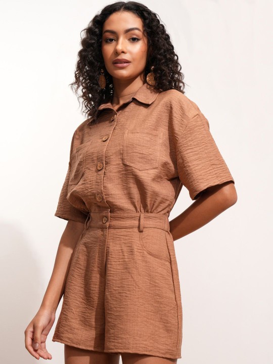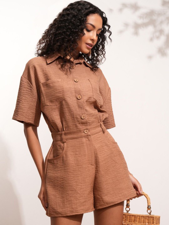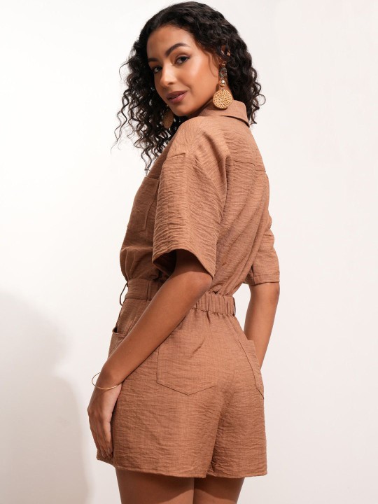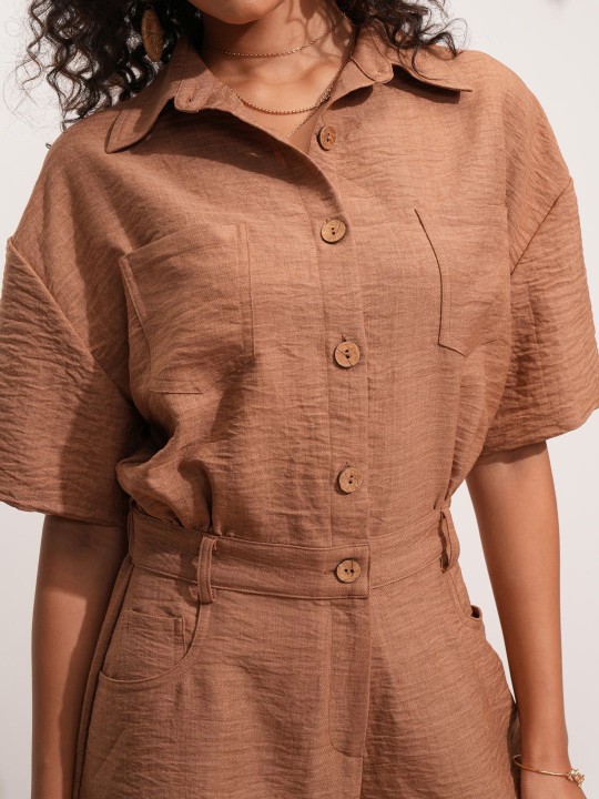 Brown solid basic jumpsuit ,has a shirt collar, short sleeves, na pockets