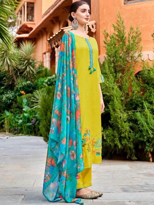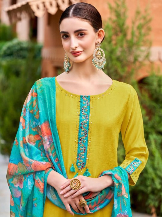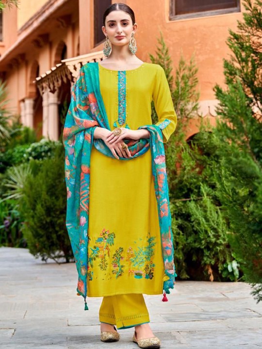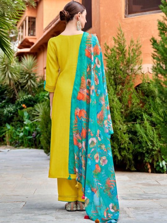 Yellow & blue, pink printed Kurta with Trousers with dupatta