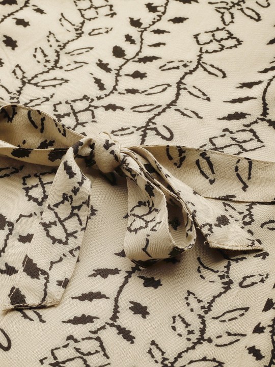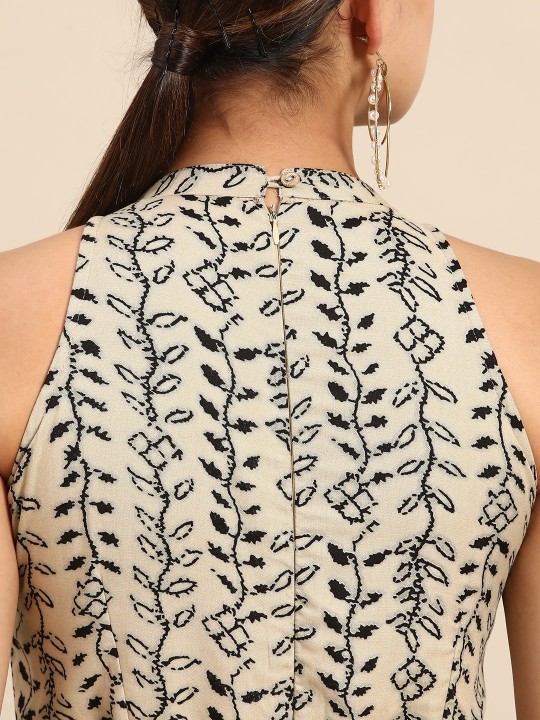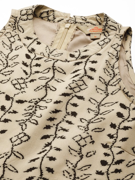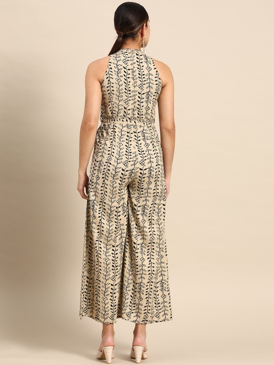 Beige and black printed basic jumpsuit with waist tie-ups ,has a round neck, sleeveless, 2 pockets