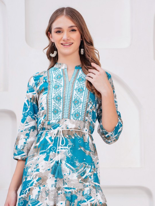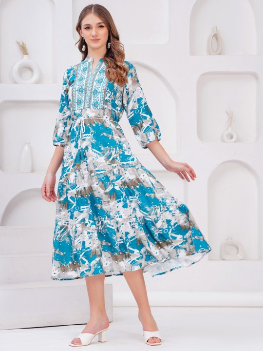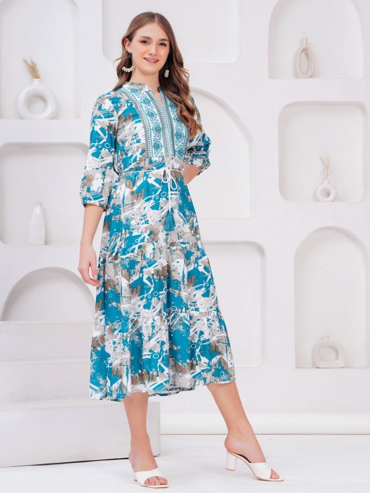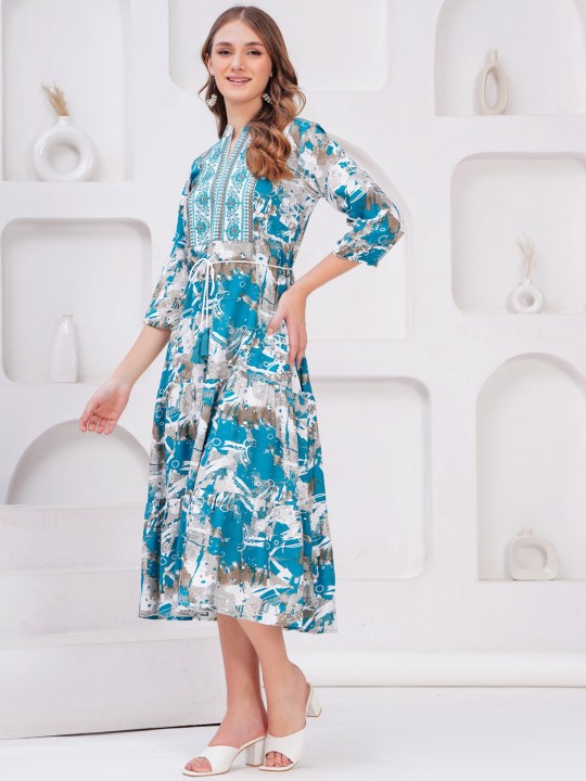 - Teal floral self design fit & flare dress