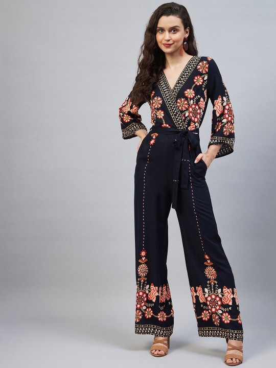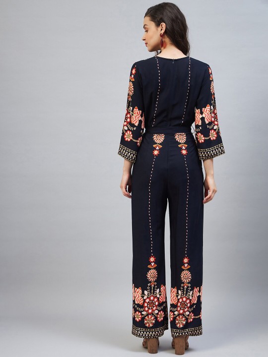 Navy blue and red printed basic jumpsuit with waist tie-ups ,has a v-neck, three-quarter sleeves, 2 pockets