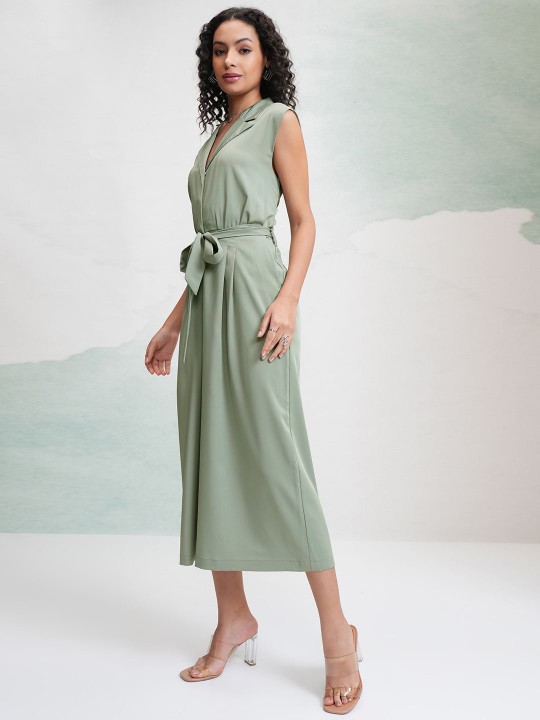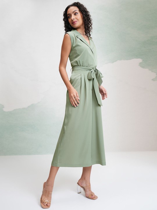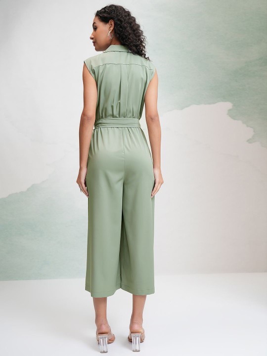 Green solid culotte jumpsuit with waist tie-ups ,has a v-neck, sleeveless, na pockets